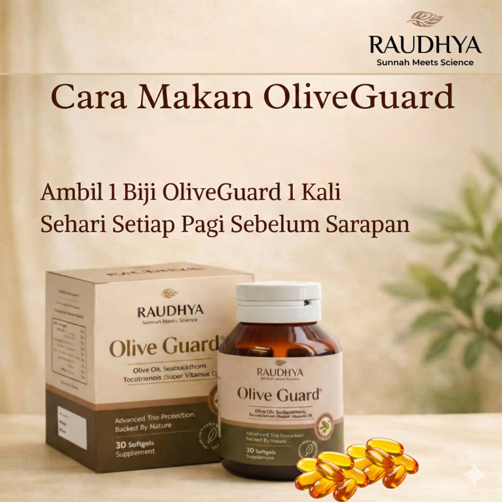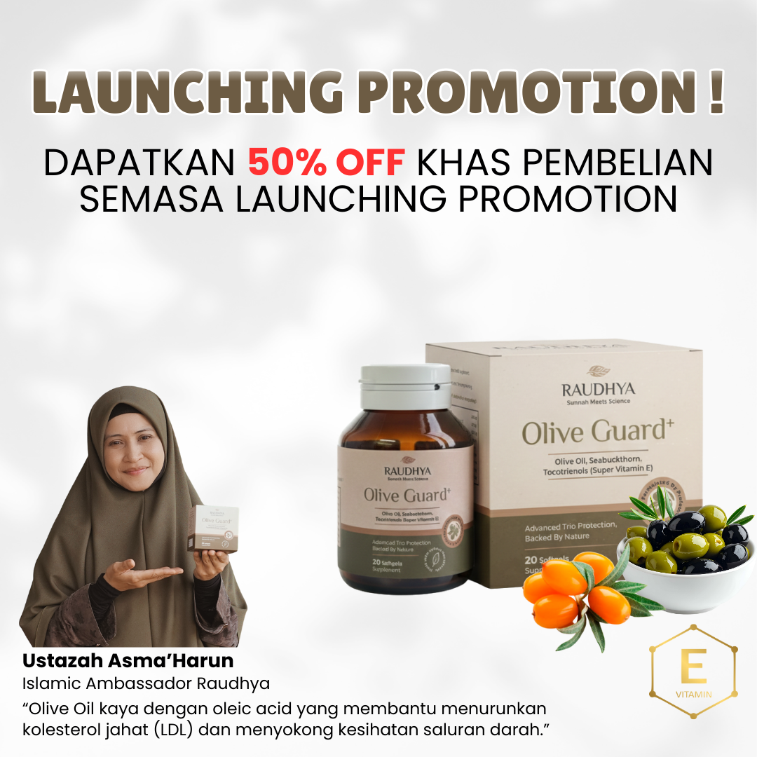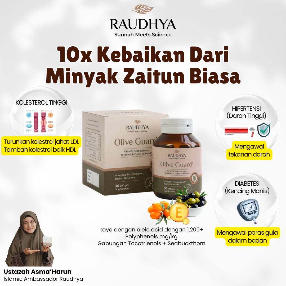 Raudhya OliveGuard+ Diperkaya Bahan Aktif Polyphenols, Tocotrienols (Super Vitamin E) & Omega Aktif Menyokong Kawalan Gula, Kolesterol & Tekanan Darah