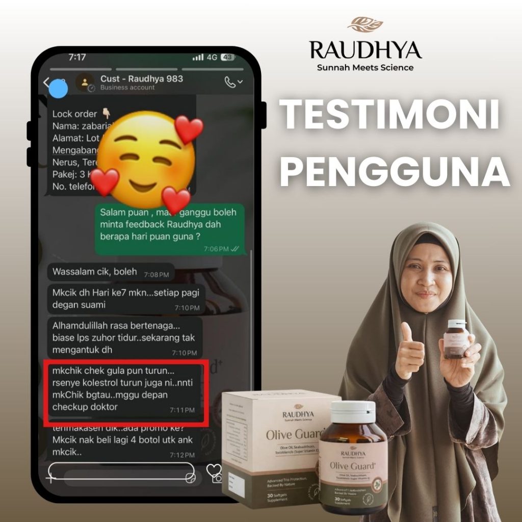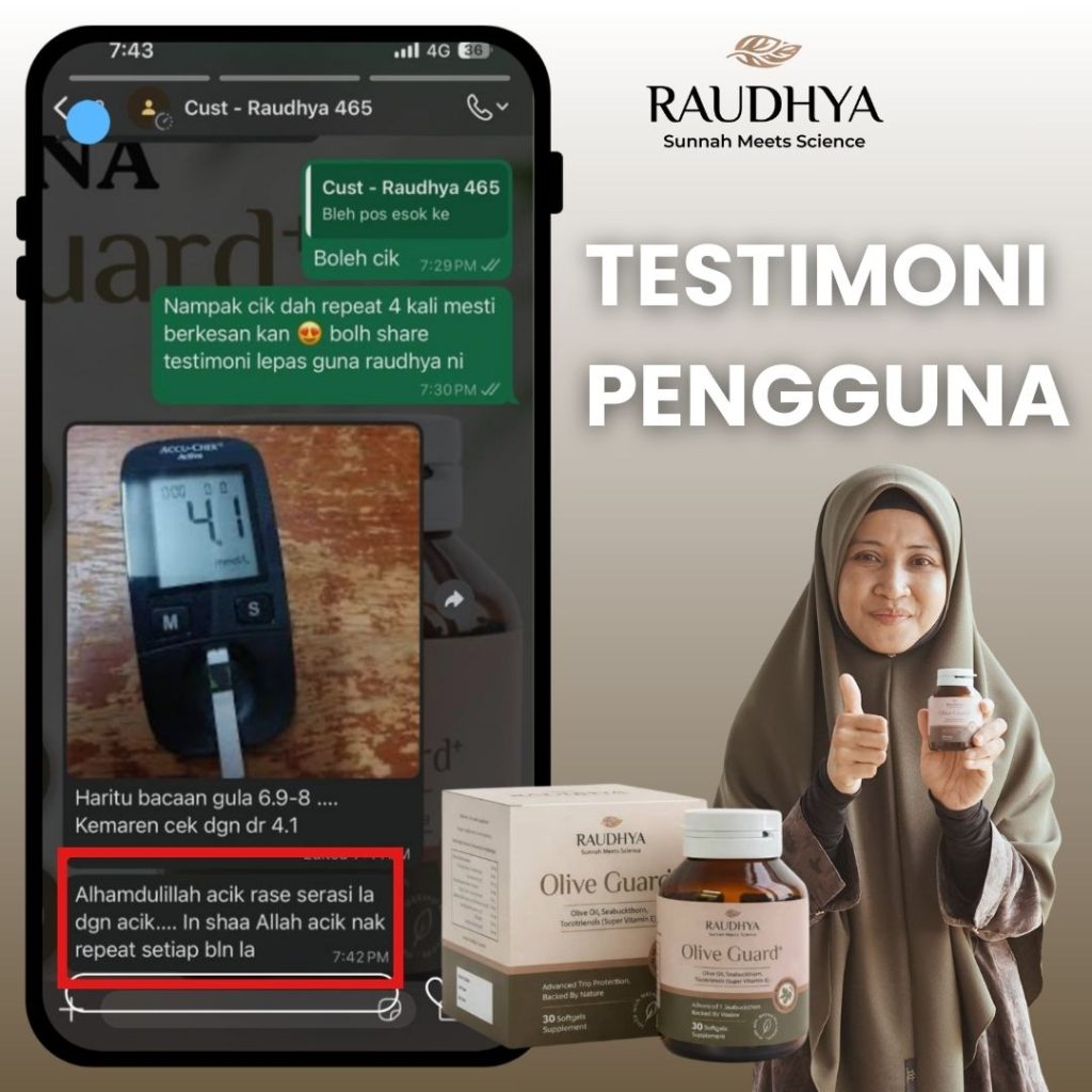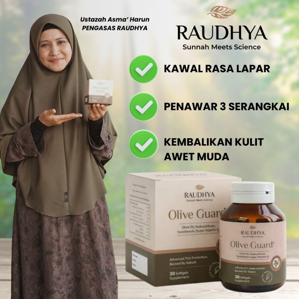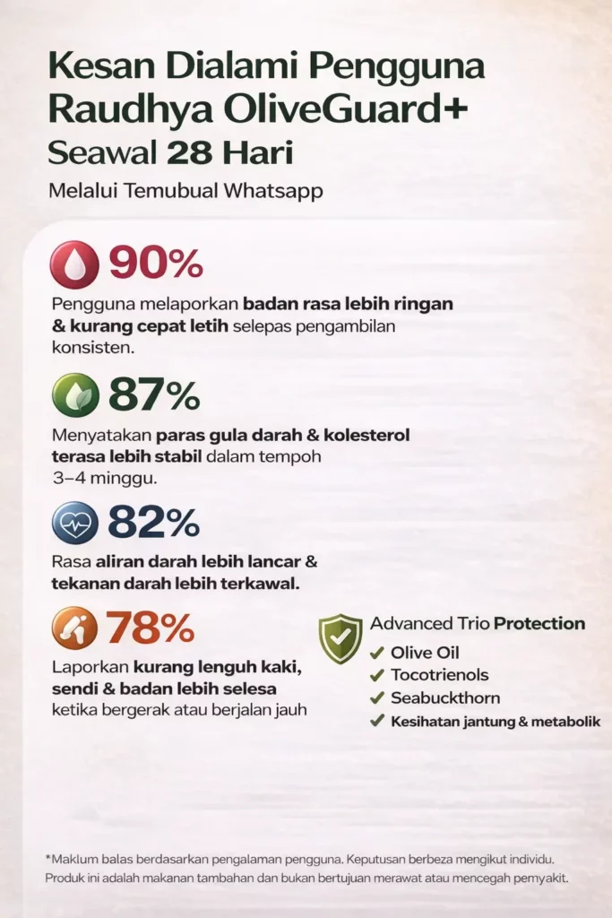 Raudhya OliveGuard+ Diperkaya Bahan Aktif Polyphenols, Tocotrienols (Super Vitamin E) & Omega Aktif Menyokong Kawalan Gula, Kolesterol & Tekanan Darah